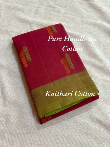 🌸 Timeless Cotton Elegance Discover the beauty of everyday tradition with the “Vimala” Pure Cotton Saree, exclusively from Kaithari Nesavu Sarees. Designed with a striking contrast pallu and small contrast border, this saree combines classic...